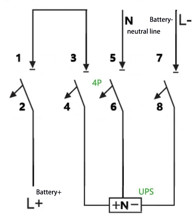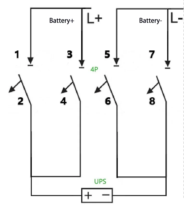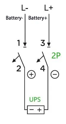 E:Ad esempio: per un UPS con una capacità di 40 kVA, una stringa di batterie nominale di 40 celle e collegamento del cavo neutro (tensione di carica equalizzante: 14 V × 40 = 560 V, ovvero ±280 V), la corrente operativa massima è calcolata come 40 kVA × 1,0 ÷ 90% ÷ 10 V ÷ 40 = 111 A. A 4P 750 V 150 È possibile adottare un interruttore con due poli collegati in serie. Il metodo di cablaggio è il seguente: