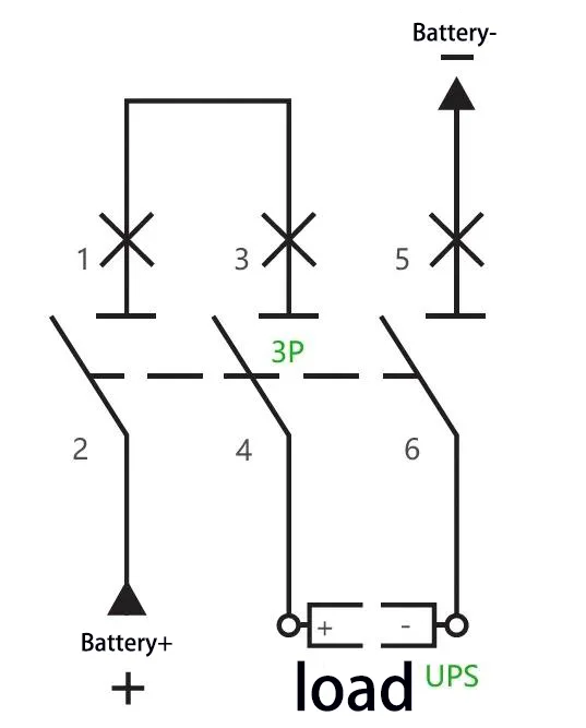C:Ad esempio: Per un UPS con capacità di 40 kVA e una stringa di batterie nominale di 40 celle (tensione di carica equalizzata: 14 V × 40 = 560 V), la corrente massima di funzionamento è calcolata come 40 kVA × 1,0 ÷ 90% ÷ 10 V ÷ 40 = 111 A. È possibile adottare un interruttore automatico 3P 750 V 150 A, con due dei suoi poli collegati in serie. Il metodo di cablaggio è il seguente: